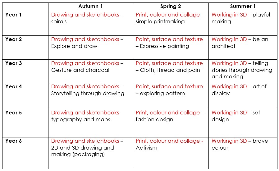 Our art progression map follows each unit from Year 1 - Year 6 and details prior learning, new skills introduced and key vocabulary. Children revisit knowledge and skills frequently to develop their understanding and independence.